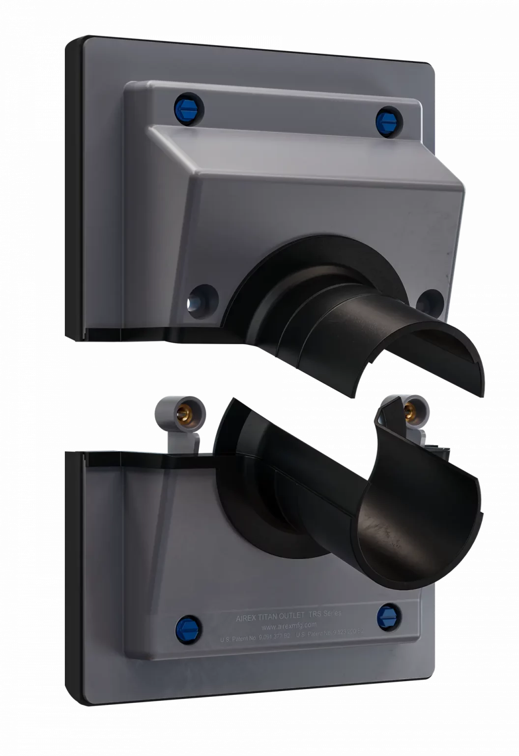 The AIREX TITAN OUTLET™ is an engineered wall enclosure system that seals and protects HVACR piping penetrations from weather damage, air leakage, pipe vibration, and pests to help HVACR professionals aesthetically meet mandatory building requirements and energy efficiency standards. Utilizing weather resistant and outdoor durable engineered polymers, the AIREX TITAN OUTLET™ enclosure is made of ASA polymer, while the elastomeric outlet sleeve is made of an engineered TPE polymer for airtight sealing around HVAC piping. The enclosure and sleeve are bonded together through a process called over-molding, chemically and mechanically bonding them together as one piece. The wall surface gasket attached to the outlet enclosure is durable PVC foam that creates a positive seal on irregular surfaces. Included accessories consist of 4 carbon steel anchor screws and one stainless-steel clamp to ensure outdoor installation durability. Utilize the AIREX TITAN OUTLET™ to aesthetically meet mandatory building requirements and energy efficiency standards.