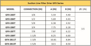 The GFX series suction line filter drier, uses a high-density filter that effectively filters impurities. It is installed at the end of the system to focus protection on the compressor.